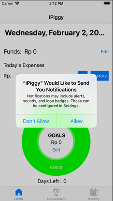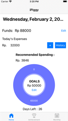 iPiggy is a group project for my iOS Foundation Program Apple Developer Academy at BINUS International. I was tasked in writing the app using Swift, converting the mock up into a working and functional prototype complete with working database and user interactions.